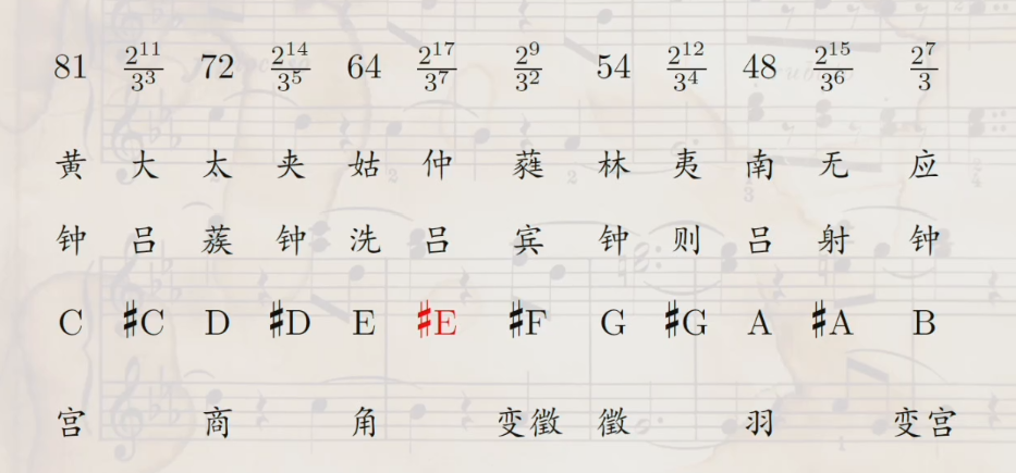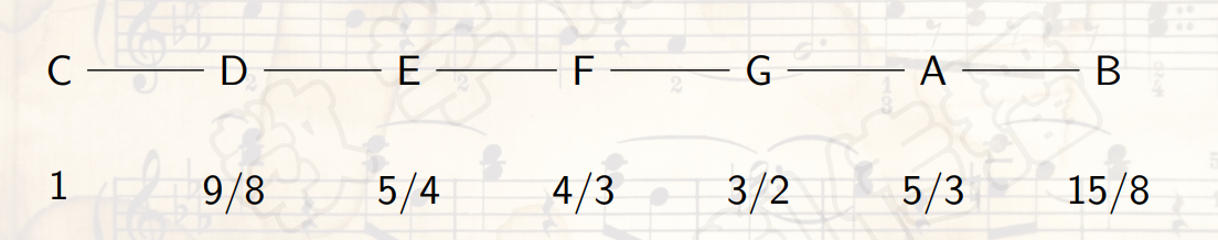 - 根据 $\sharp F$ 跟高八度的 $\sharp C$ 构成纯五度音,推出 $\sharp C$ 的频率 $16:15$。