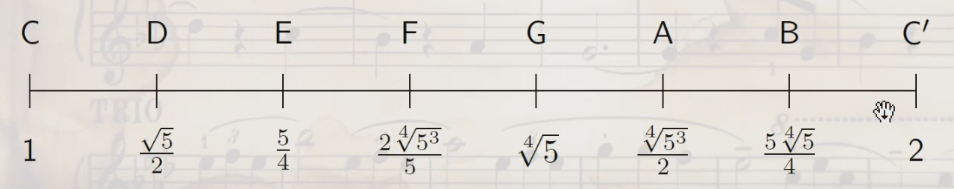 - 再考虑 $F$ ,由于其上方五度的音级 $C’$ 与 $F$ 的比值应该等于生律元素 $\sqrt[4]{5}$,解得 $F$ 的音级为 $\frac{2\cdot 5^{\frac{3}{4}}}{5}$。