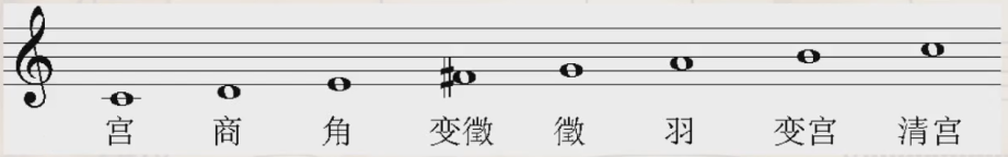 | (徵) | (羽) | (变宫) | 宫 | 商 | 角 | 变徵 | 徵 | 羽 | 变宫 |