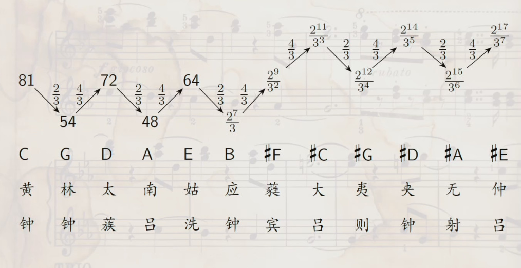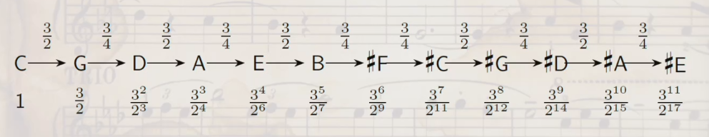 - 毕达哥拉斯假设中央$C$对应的频率为1,其上方五度的$G$对应的频率为$\frac{3}{2}$。