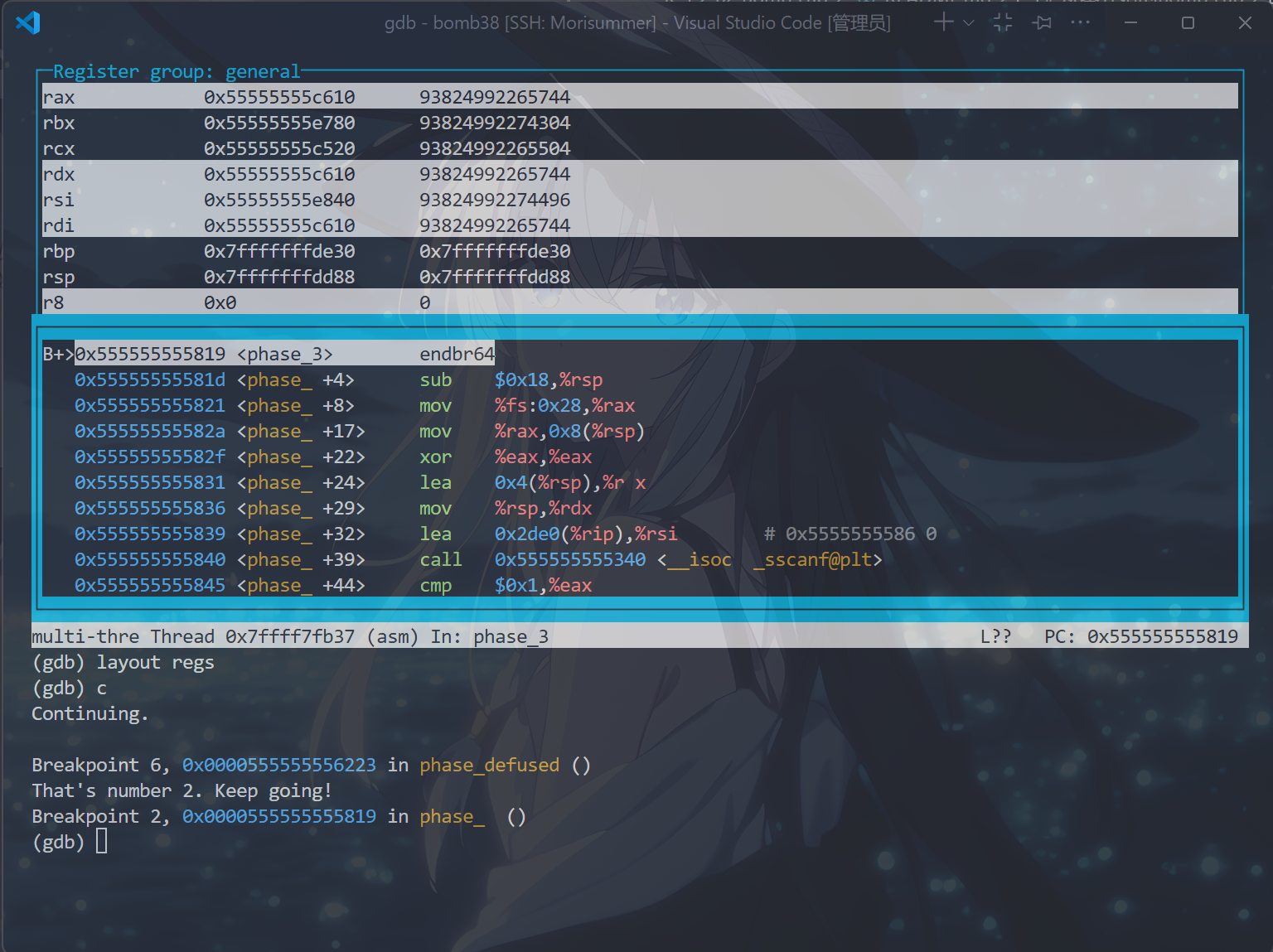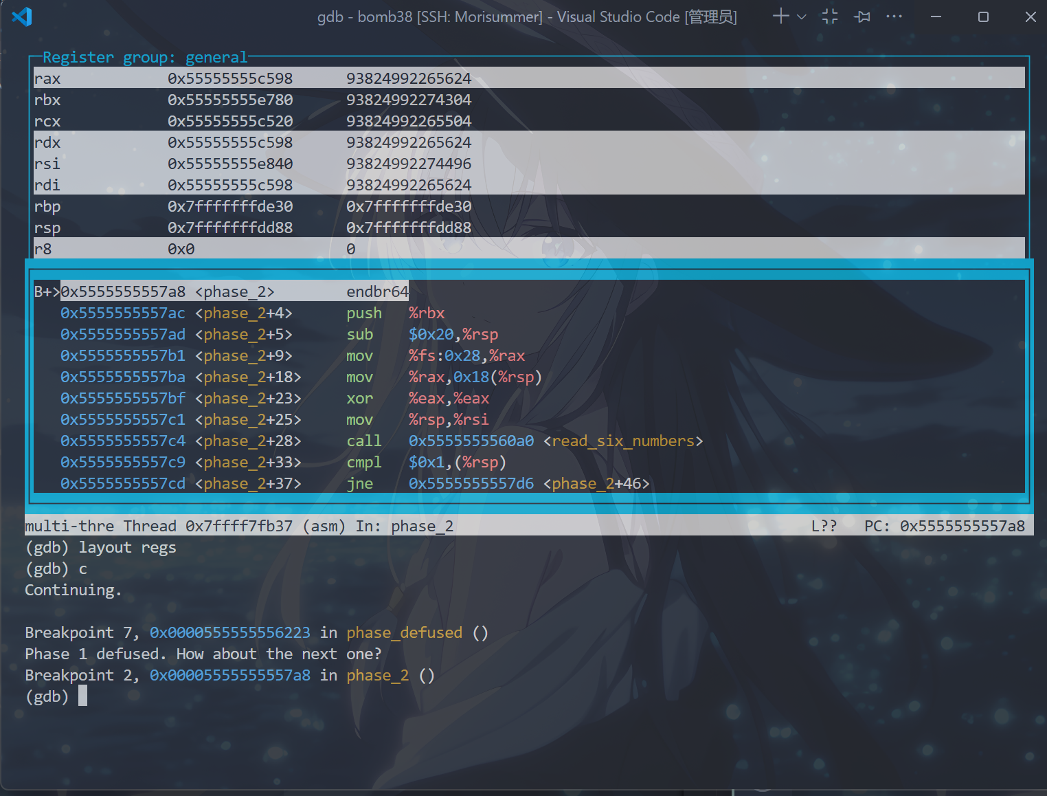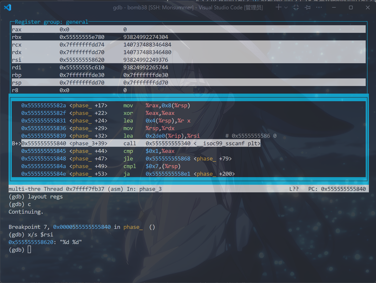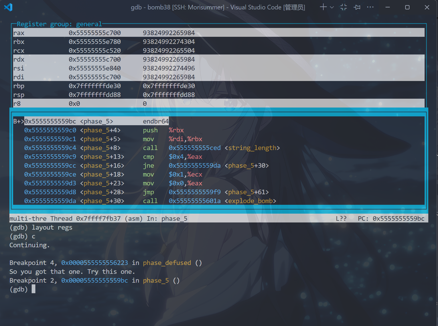 b phase_x // 这条如果配置了.gdbinit文件就无须再输入