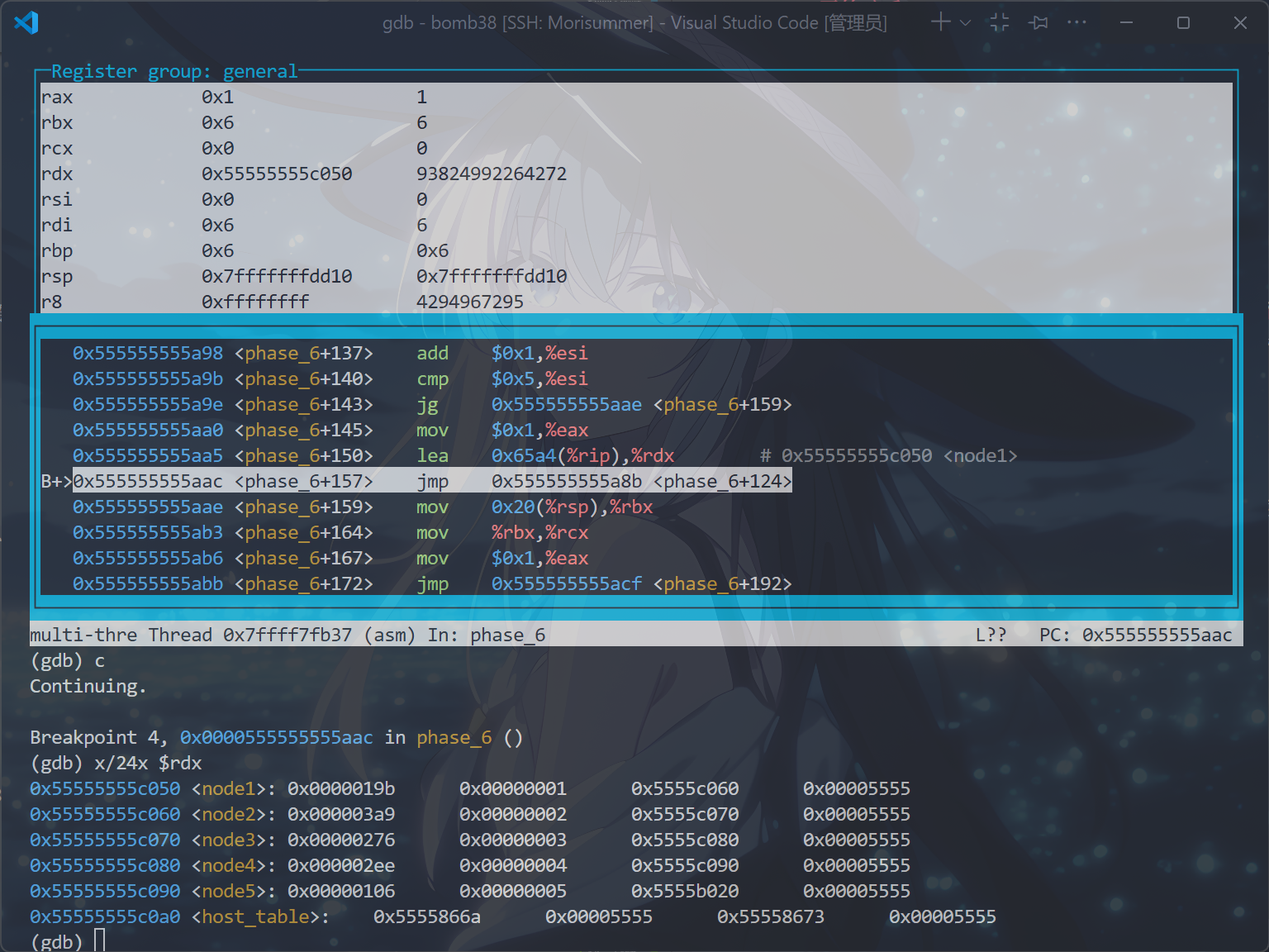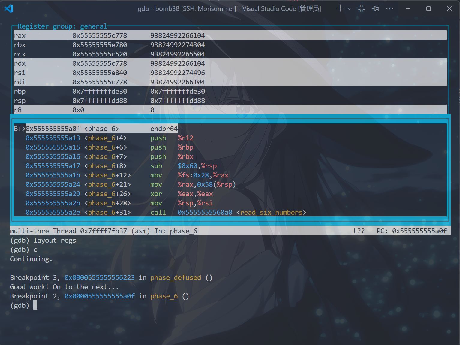将psol.txt的第六行替换为答案,注释掉b phase_6,打开终端,运行以下命令: